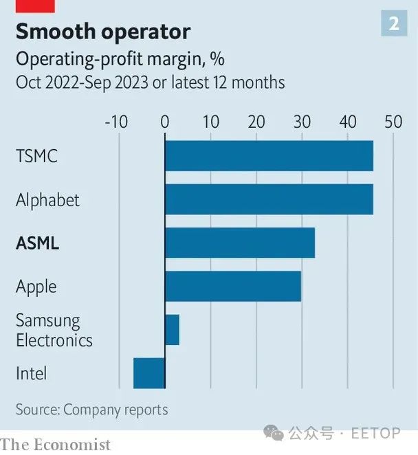 ASLM 还利用一台设备的数据来调整其他设备的旋钮。自 39 年前成立以来,该公司已售出约 5,500 台设备,其中 95% 仍在运行,许多设备还向总部发送数据。这将使其产品更加出色,从而带来更多的芯片制造,产生更多的数据,如此循环往复,形成一个 "飞轮",这通常与互联网搜索等数字服务有关。