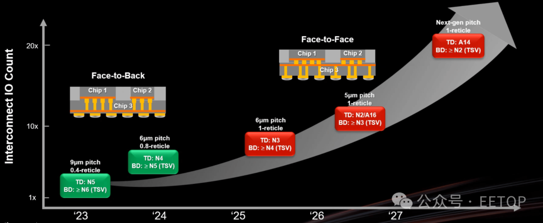 台积电张晓强表示:“我们从面到背的集成开始,将两个芯片组合在一起。我们也在开发面对面的集成方式,让客户能够最大限度地提高两个芯片之间的互连密度。如果你看一下我们将芯片堆叠在一起时的混合键合间距,它将从 9 微米继续缩小到 6 微米,甚至可以低至 5 微米及以下。这种集成将包括面到背和面对面的方式,以满足不同的应用需求。”