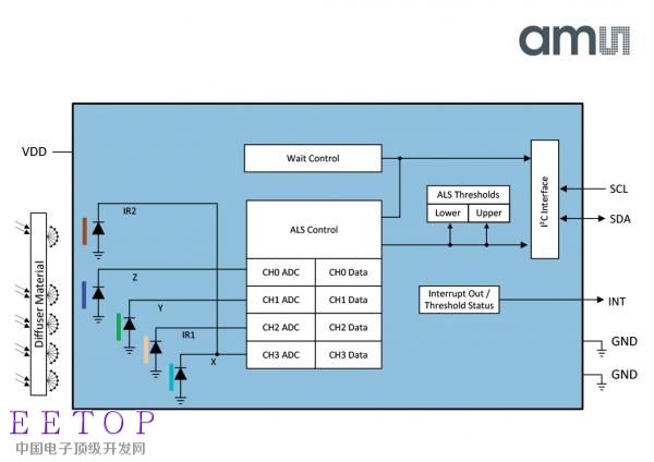 TCS3430采用了艾迈斯半导体专有的光学干涉滤波器技术。干涉滤波器可直接沉积在晶圆上,且能模拟人眼的光谱响应的特性。TCS3430的滤波器具有五个通道,包括X、Y、Z通道以及两个红外通道。两个红外通道可用于推断光源类型。Y通道则为可见光光谱中的绿光部分提供照度测量,使得TCS3430可同时用作环境光传感器与颜色传感器。