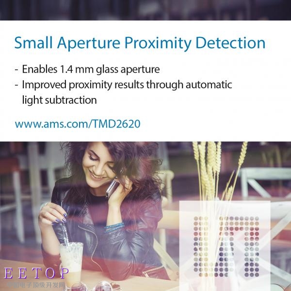 使用TMD2620接近传感器或TMD2725接近及环境光三合一传感器模块,可使智能手机制造商们将光感开孔尺寸缩小至原来的50%,这有助于美化手机外观,特别是白色或浅色面板的手机。TMD2620及TMD2725能够使开孔尺寸分别减小至1.4及2.0毫米。