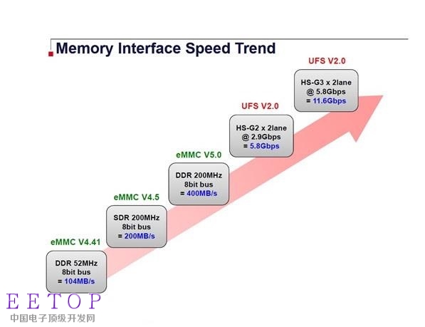 从图中我们可以看到,UFS 2.x 的性能是非常强大的,不论读取速度还是写入速度,都要大幅领先 eMMC。