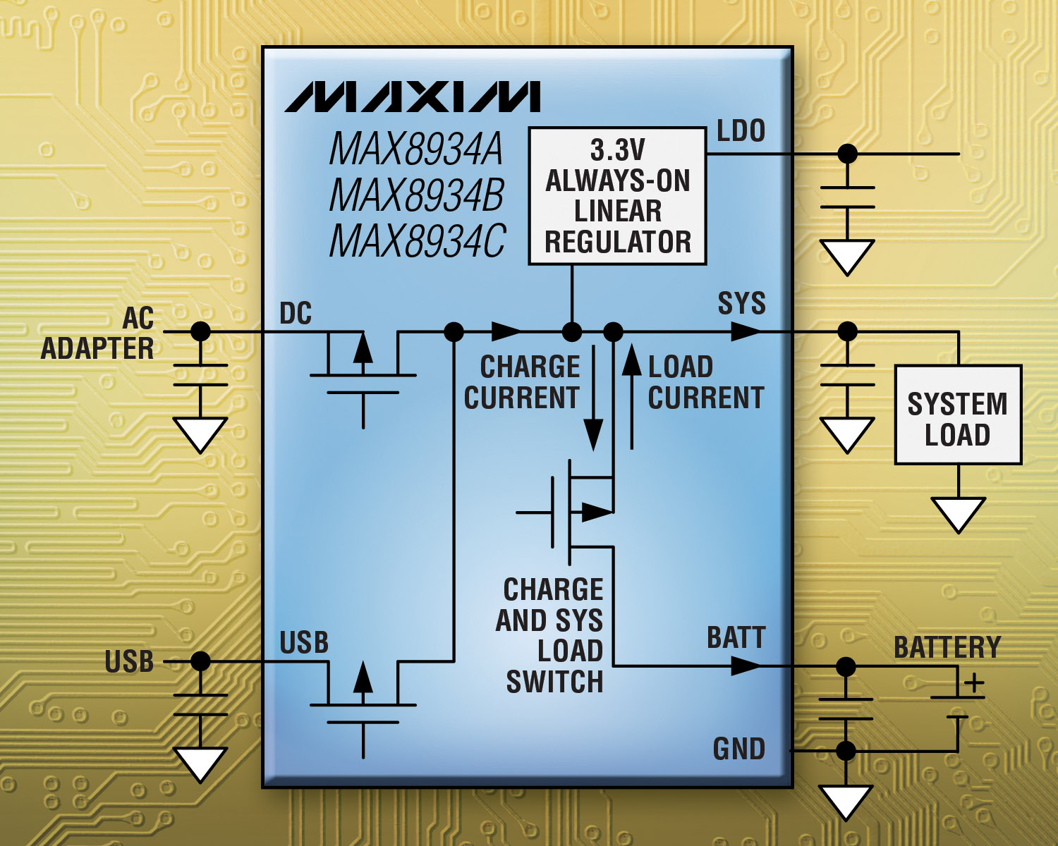 2010-04-06 15:55:57 本站原创Maxim推出业内首款集成智能电源选择器(Smart Power Selector™)电路的双输入线性充电器MAX8934,器件符合JEITA (日本电子信息技术产业协会)推荐标准,能够在各种温度条件下实现安全充电。MAX8934监测电池温度,根据温度的变化自动将充电电流和充电终止电压调节到安全水平。连接外部电源时,智能电源选择器电路允许系统在无电池或电池深度放电的情况下工作,自动将系统负载由电池切换至外部电源。器件集成了充电以及在电池与外部电源之间切换负载所需的所有电流检测电路和功率开关,可为智能电话、数码相机、多媒体播放器、游戏系统及GPS导航系统等采用单节Li+电池供电的手持设备提供理想的紧凑方案。MAX8934可以采用独立的USB和交流适配器电源输入供电,也可用单个输入连接两种电源。直流输入限流值最高可调节至2A,USB输入限流值最高可调节至1.5A*。直流与USB输入均支持100mA、500mA、1.5A和USB挂起模式。充电电流最高可调节至1.5A,支持较宽范围的电池容量。器件的其它特性包括:防止过热的热调节环路、自适应电池充电功能在满足系统负载供电的前提下为电池充电、OVP (过压保护)、漏极开路充电状态和故障指示输出、电源就绪监测器、充电定时器以及电池温度监测器。MAX8934采用节省空间、增强散热的4mm x 4mm、28引脚TQFN封装,工作在-40°C至+85°C温度范围。可提供评估板以简化设计。