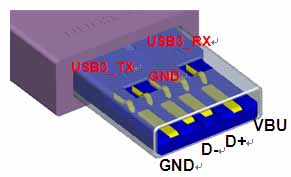 USB3.0的A型接口外形与USB2.0的A型接口兼容,不同的地方是USB3.0接口添加了额外的数据线来传输超高速数据。其结构如下图所示: