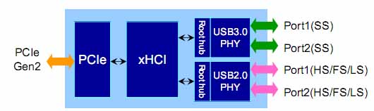 从上图可以看出uPD720200内部集成了两个根集线器,其中USB2.0的根集线器用来向下兼容原USB2.0,USB1.1的设备。USB3.0的根集线器则专门用来连接兼容USB3.0的超高速设备。uPD720200使用PCI Express总线与主系统进行通讯。NEC为这颗IC的应用提供了完整的硬件参考设计。在标准的PC系统中,NEC还可以提供Windows下的驱动程序供用户免费使用。