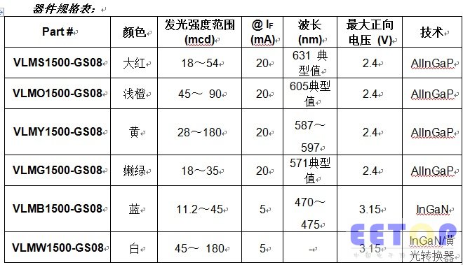 宾夕法尼亚、MALVERN — 2012 年 8 月16 日 — 日前,Vishay Intertechnology, Inc.(NYSE 股市代号:VSH)宣布,其光电子产品部发布新VLMx1500-GS08系列采用小型表面贴装0402 ChipLED封装的大红、浅橙、黄、嫩绿、蓝色和白色的超亮LED。VLMx1500-GS08系列器件的尺寸为1.0mm x 0.5mm,高0.35mm,180mcd的发光强度实现了超群亮度。