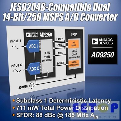 为解决这一需求,Analog Devices, Inc. (ADI: NASDAQ),全球领先的高性能信号处理解决方案供应商和数据转换技术领导者*,最近推出采用 JEDEC JESD204B 串行输出数据接口标准的双通道14位250 MSPS 模数转换器 AD9250。AD9250 ADC 是市场上首款完全达到 JESD204B Subclass 1确定性延迟要求的250 MSPS ADC,此功能通过一个串行接口支持多个数据转换通道精密同步。