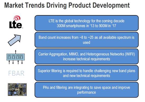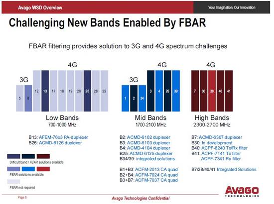 需要运行于多个不同频段和地区,支持高速LTE语音和数据传输的手机目前正加速采用 Avago 的 FBAR 技术解决困难的滤波问题,带有 4G/LTE 功能的手机通常会在紧邻现有无线电服务的新分配频谱运作,因此经常面临服务间可能的干扰。