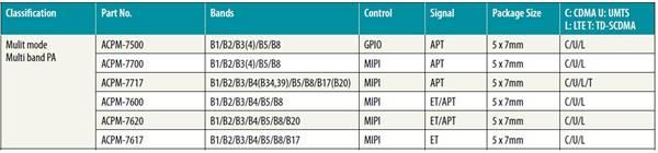 安华高多模多频段功率放大器可支持不同的操作模式(CDMA、UMTS、LTE 和 GSM/EDGE)和多个频段,采用超小型封装并为智能手机提供极佳的性能。如下图2所示,安华高为智能手机应用提供种类丰富的多模多频段功率放大器产品 系列。他们都采用5x7mm的超小封装,为千元以上智能手机提供高线性、低失真和高效率的射频前端解决方案。
