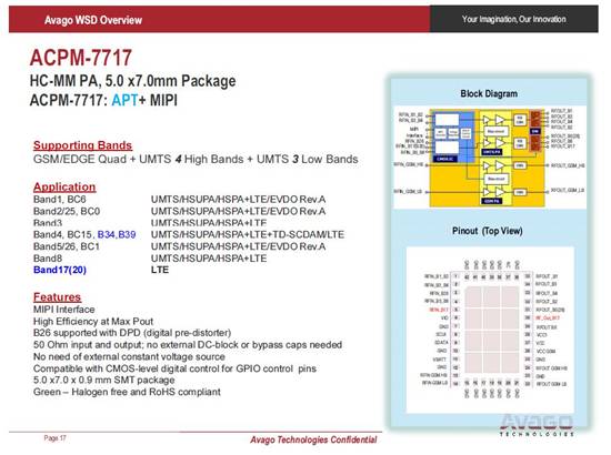 而其最新推出的ACPM-7717是四频 GSM/EDGE 和多模式 B1/B2/B3/B4/B5/B8/B17(20,28)功率放大器,增加了对于B17、B20、B28的支持尤其适合拥有海外业务的中国手机厂商。如下图3所示,为ACPM-7717的产品特性。