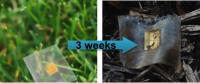 一片新制的,基于纤维素纳米原纤衬底的微波硅晶体管片。在它丢入木料堆三个星期后,该晶片已经在菌类的作用下部分被分解。