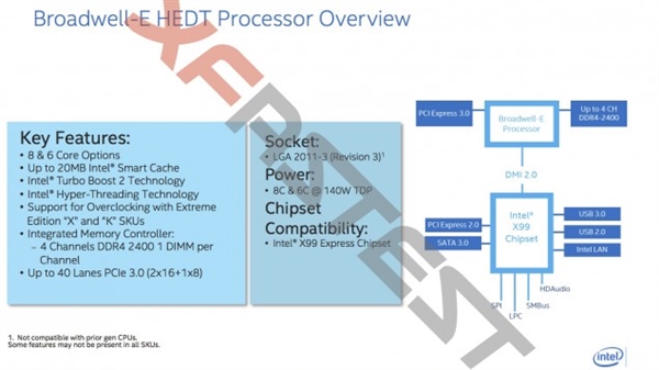 除此之外,Broadwell-E的最高功耗将达到140W,二缓提升至20MB,拿8核心来说,大家都能平均分得2.5MB。当然,支持DDR4内存、改进的PCI-e 3.0特性,多显卡CF、SLi也更爽。