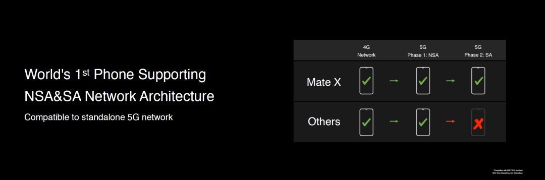 搭载巴龙5000的HUAWEI Mate X可以 同时支持NSA和SA组网方式 ,不管运营商是NSA组网还是SA组网,均可正常接入,是一“部”到位的5G手机。