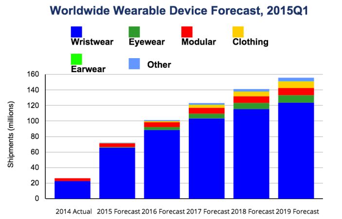 IDC所指的可穿戴设备包括“基本可穿戴设备”(手腕饰件、眼戴式装置、模组化(modular)可穿戴装置、服装、耳戴式装置等)和“智能可穿戴设备”,因此它估计的数据并非只包括Apple Watch和Android Wear智能手表,还包括健身追踪器、眼镜,以及配置或没有配置显示屏的其他可穿戴设备。在去年的可穿戴设备销量中,基本可穿戴设备销量为2210万块,智能可穿戴设备销量为420万块。但IDC预计,今年两类可穿戴设备销量的差距将会缩小,其中基本可穿戴设备销量将占到3900万块,智能可穿戴设备占到3310万块。