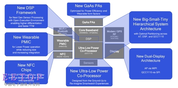 规格方面,骁龙3100基于28nm工艺,采用四核Cortex A7架构(32bit),主频1.2GHz,搭配一颗功耗低20倍的协处理器QCC1110(5.2x4mm,21mm2)和一颗高效的DSP,同时还集成NXP的NFC芯片。